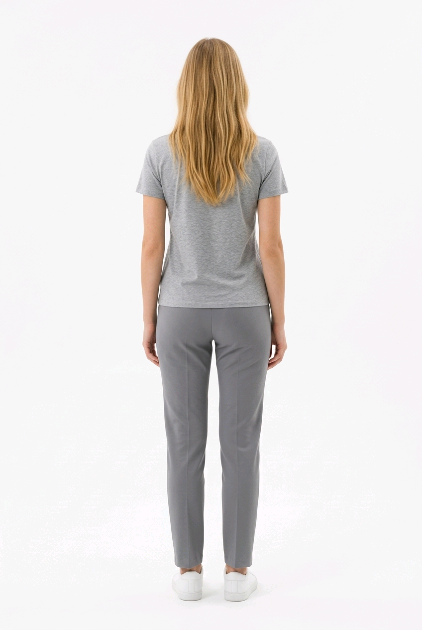 Deze stijlvolle grijze pantalon straalt klasse en verfijning uit. De subtiele knoopdetails geven de broek een luxe uitstraling, terwijl de strakke snit zorgt voor een elegant en flatterend silhouet.