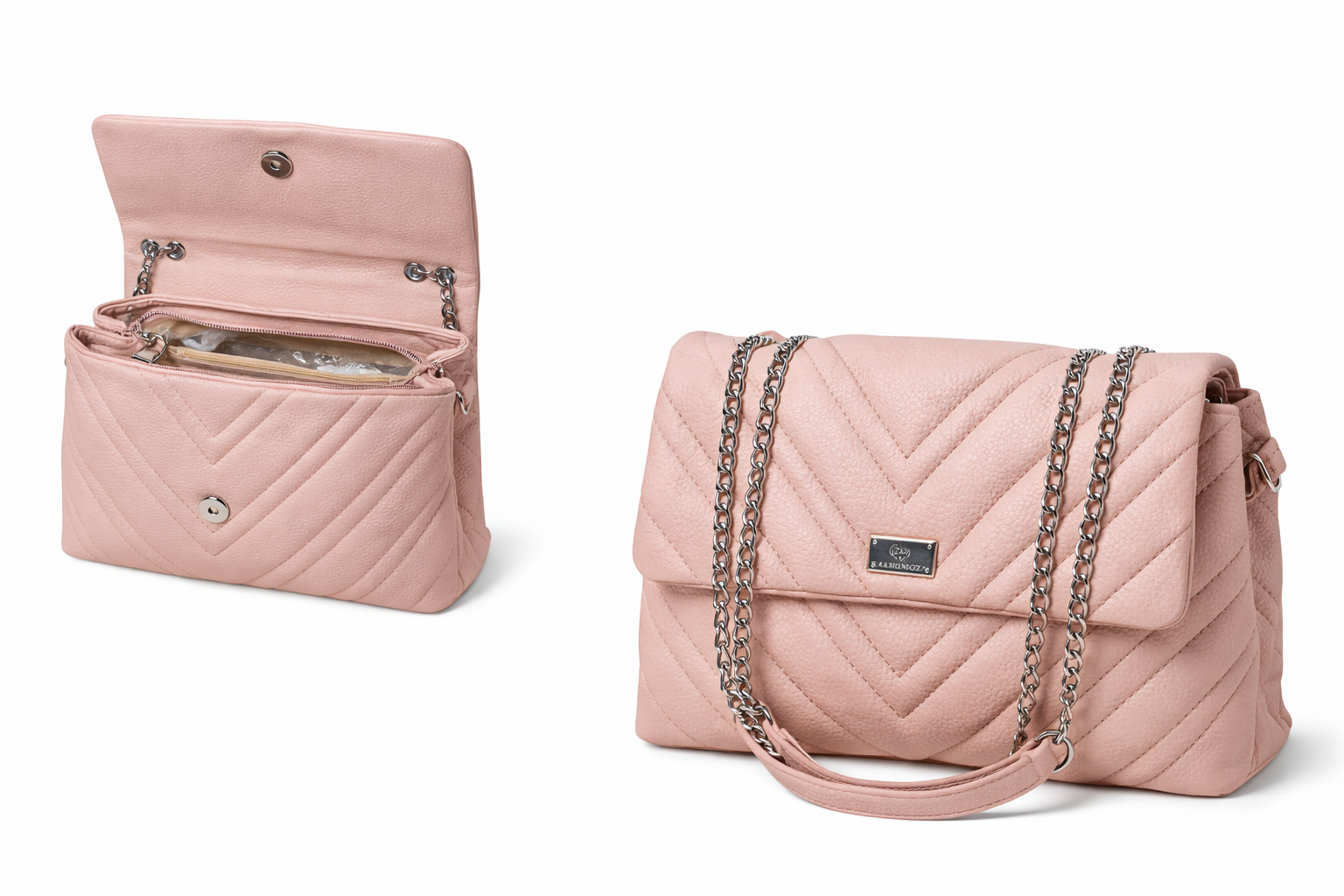 Deze elegante gewatteerde handtas in zachtroze kleur is een echte must-have voor elke fashion lover. Het klassieke quilted design gecombineerd met de stijlvolle metalen ketting zorgt voor een luxe en tijdloze uitstraling.